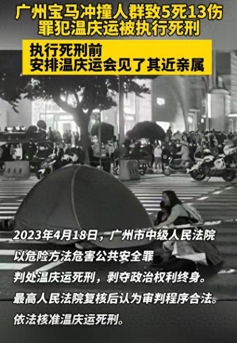 4月19日,广州河汉良马冲撞东谈主群致6东谈主死字一案终于迎来最终判决,撞东谈主的00后须眉温庆运被奉行死刑。