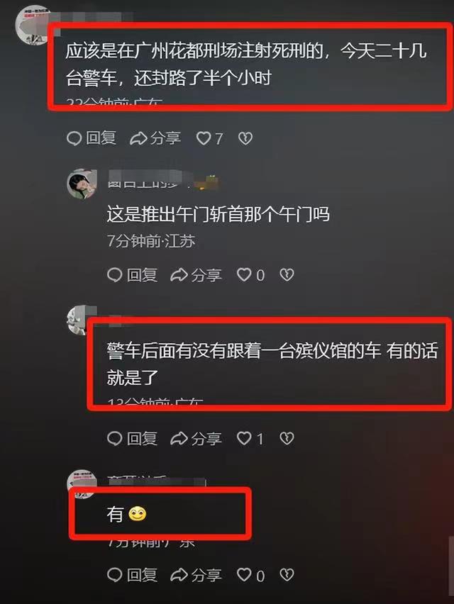有网友亲眼目击,在去往广州花王人法场的路上,有20多辆警车,后头还奴隶一辆殡仪馆车。