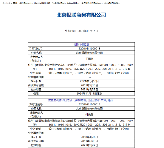 11月19日金融一线音信,央行官网近日更新的支付捏照刊出名单清晰,北京银联商务有限公司的支付捏照已被刊出。刊出时分为2024年11月11日。