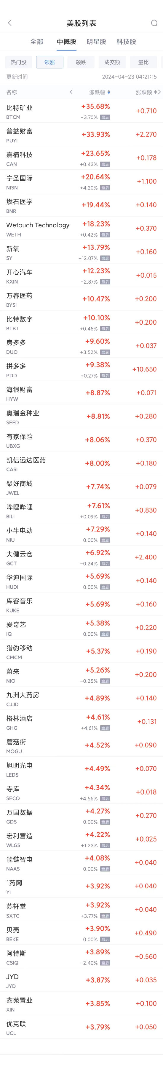 领涨中概股列表: