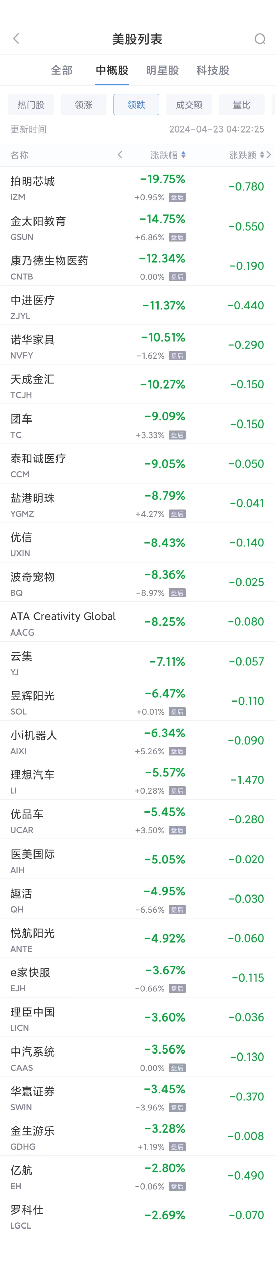 领跌中概股列表: