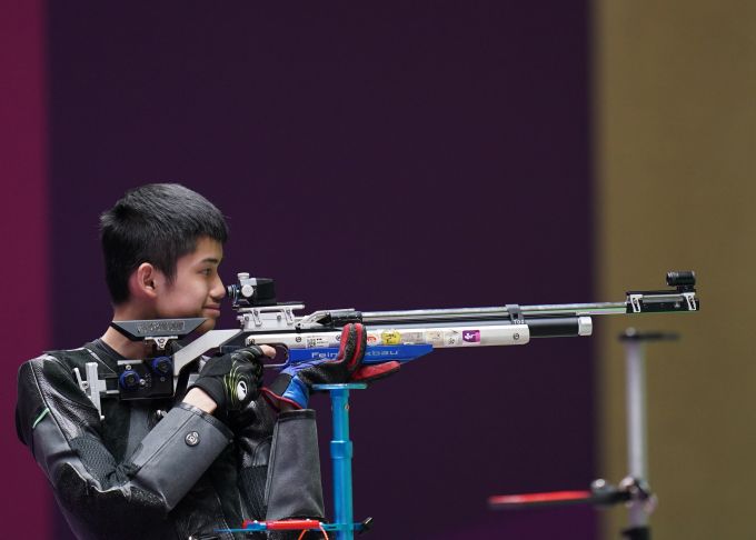 2021年7月25日,盛李豪在比赛中。当日,在东京奥运会射击须眉10米气步枪毙赛中,中国选手盛李豪获取银牌。新华社记者 鞠焕宗 摄